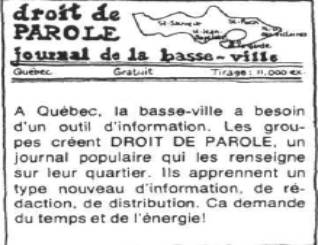 On a vu se multiplier les associations de locataires, les comptoirs alimentaires, les cliniques de santé communautaire et juridiques, les garderies populaires, les groupes de lutte pour la protection de l'environnement, pour la défense des droits sociaux, des droits des femmes, des travailleurs émigrés... Le développement du syndicalisme, sa radicalisa-tion, la prolifération des groupes populaires, autant de réponses des victimes de la croissance économique dans le Québec d'après-guerre.