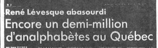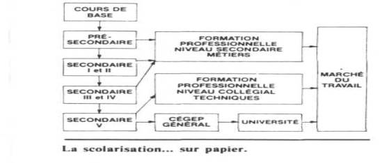 La réforme du système scolaire entreprise chez nous à la suite des travaux de la Commission Parent, lors de la révolution tranquille des années 60, était officiellement commandée par un souci de démocratisation et, notamment, d'accessibilité des ressources éducatives scolaires, de la maternelle à l'université, pour l'ensemble des Québécois. Cette réforme fut principalement celle de l'école des jeunes. Malgré que le Québec se soit doté d'une politique en matière d'éducation des adultes, le premier ministre du Québec, M. René Lévesque, affirmait en 1978 que quelque 500 000 adultes, c'est-à-dire 1/8 de la population adulte du Québec, tentent présentement leur "seconde chance" scolaire : 400 000 au niveau secondaire, 20 000 au collégial, entre 60 000 et 75 000 à l'université.
